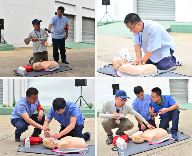 完成30次的胸外按压操作后,便可以采取仰头抬颏法或托颌法开放患者的气道,进行人工呼吸。家人们纷纷上场参与实际演练,为了今后在某个关键时刻可以帮助他人,每一个步骤都精益求精做到标准。