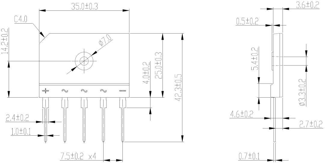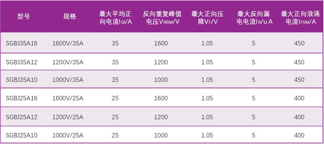 - ■ 耐压最高可达1600V,工作电流最大可达35AVRRM≤1600V,IO≤35A